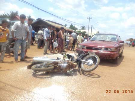 ខេត្តរតនគិរី ៖ រថយន្តកាមរីគូទស្វិតបើកក្នុងល្បឿនលឿនមកដល់ចំណុចផ្លូវបំបែកជា៤ ក៏មិនបង្អន់ដែរហើយក៏បានបុកនិងបុរសជិៈម៉ូតូម្នាក់បណ្តាលឲ្យបែកមុខនិងបែកភ្នែកម្ខាង ហេតុការណ៍នេះកើតឡើងនៅវេលាម៉ោង១១និង៣០នាទី ថ្ងៃទី២២ ខែឧសភា ឆ្នាំ២០១៥ នៅចំណុចផ្លូវបំបែកជា៤ ស្ថិតនៅភូមិអូរកន្ទិល សង្កាត់បឹងកន្សែង ក្រុងបានលុង។ រថយន្តបង្កម៉ាកកាមរីស្វិត ពណ៌ក្រហម ពកាស្លាកលេខភ្នំពេញ 2D-6230 បើកបរដោយឈ្មោះសោរអៀង ភេទប្រុស អាយុ៤៨ឆ្នាំ ជនជាតិខ្មែរ មានទីលំនៅក្រុងបានលុង រីឯម៉ូតូដែលត្រូវរថយន្តបុកនោះមានពួយ បុល ភេទប្រុស អាយុ៤៦ឆ្នាំ ជិៈម៉ូតូម៉ាកC125 ពណ៌ខ្មៅ ស៊េរីឆ្នាំ២០១០ ពាក់ស្លាកលេខ រតនគិរី 1C-3240 មានទីលំនៅភូមិ១ និងមានស្រុកកំណើតខេត្តព្រៃវែង រងរបួសបែកភ្នែកម្ខាង និងម៉ូតូខូចទាំងស្រុង។