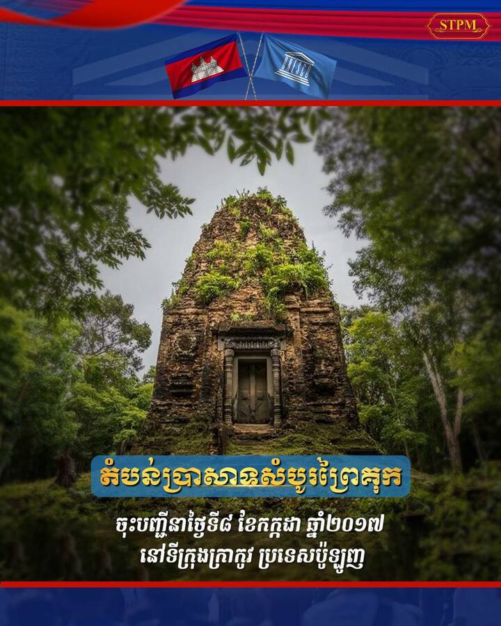 – តំបន់ប្រាសាទសំបូរព្រៃគុក ចុះបញ្ជីនាថ្ងៃទី៨ ខែកក្កដា ឆ្នាំ២០១៧ នៅទីក្រុងក្រាកូវ ប្រទេសប៉ូឡូញ