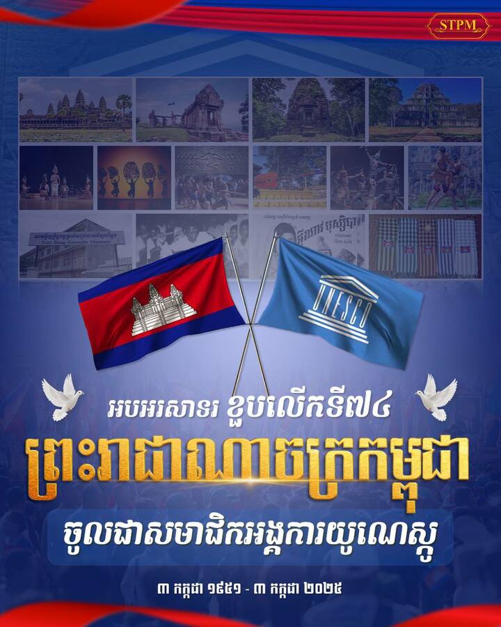 សម្តេចមហាបវរធិបតី ហ៊ុន ម៉ាណែត នាយករដ្ឋមន្ត្រីនៃកម្ពុជា នាថ្ងៃទី៣ ខែកក្កដា ឆ្នាំ២០២៥នេះ បានផ្ញើសារចូលរួមអបអរសាទរ ខួបលើកទី៧៤ ព្រះរាជាណាចក្រកម្ពុជា ចូលជាសមាជិកអង្គការយូណេស្កូ ( ៣ កក្កដា ១៩៥១ ~ ៣ កក្កដា ២០២៥ )។