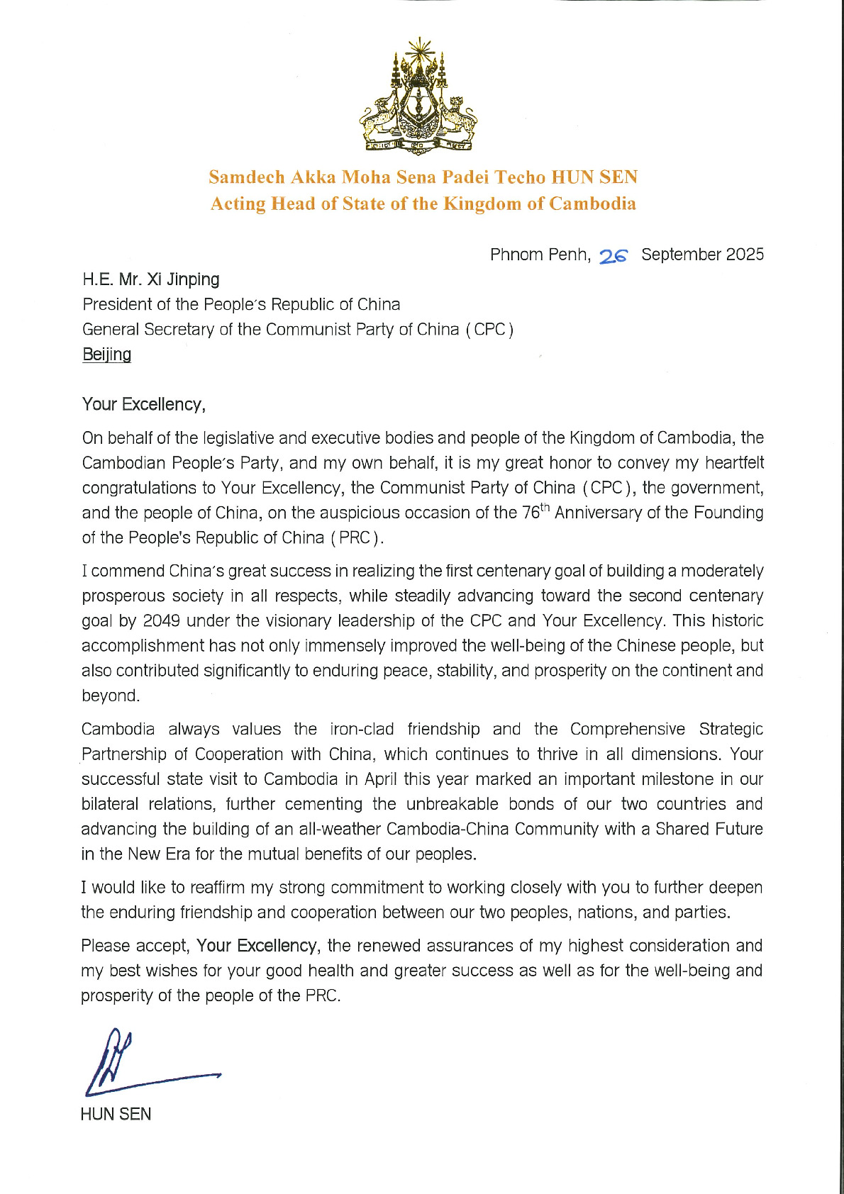 សារលិខិតរបស់សម្ដេចតេជោ ហ៊ុន សែន មានខ្លឹមសារដូចតទៅ៖ «ឯកឧត្តម ជាទីគោរពរាប់អានដ៏ជ្រាលជ្រៅ! ក្នុងនាមអង្គនីតិប្បញ្ញត្តិ នីតិប្រតិបត្តិ និងប្រជាជននៃព្រះរាជាណាចក្រកម្ពុជា, គណបក្សប្រជាជនកម្ពុជា និងក្នុងនាមខ្ញុំផ្ទាល់ ខ្ញុំមានកិត្តិយសដ៏ខ្ពង់ខ្ពស់សូមសម្តែងនូវអំណរសាទរអស់ពីដួងចិត្តចំពោះ ឯកឧត្តម បក្សកុម្មុយនីស្តចិន រដ្ឋាភិបាល និងប្រជាជនចិន ក្នុងឱកាសដ៏នក្ខត្តឫក្សនៃខួបលើកទី៧៦ នៃការបង្កើត សាធារណរដ្ឋប្រជាមានិតចិន។