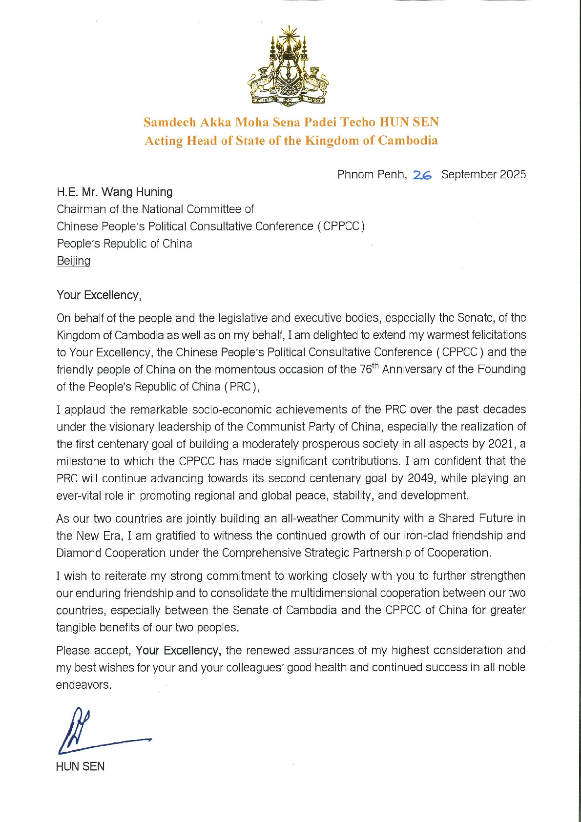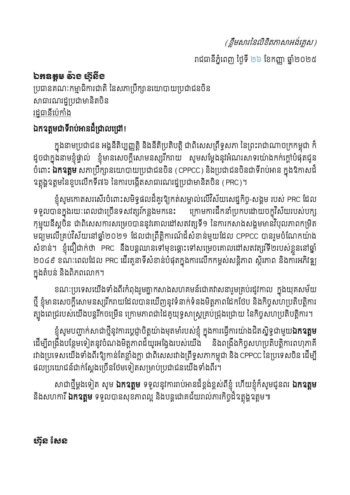 សារលិខិតរបស់សម្ដេចតេជោ ហ៊ុន សែន មានខ្លឹមសារដូចតទៅ៖ «ឯកឧត្តមជាទីរាប់អានដ៏ជ្រាលជ្រៅ! ក្នុងនាមប្រជាជន អង្គនីតិប្បញ្ញត្តិ និងនីតិប្រតិបត្តិ ជាពិសេសព្រឹទ្ធសភា នៃព្រះរាជាណាចក្រកម្ពុជា ក៏ ដូចជាក្នុងនាមខ្ញុំផ្ទាល់ ខ្ញុំមានសេចក្តីសោមនស្សរីករាយ សូមសម្តែងនូវអំណរសាទរយ៉ាងកក់ក្តៅបំផុតជូន ចំពោះ ឯកឧត្តម សភាប្រឹក្សានយោបាយប្រជាជនចិន (CPPCC) និងប្រជាជនចិនជាទីរាប់អាន ក្នុងឱកាសដ៏ ឧត្តុង្គឧត្តមនៃខួបលើកទី៧៦ នៃការបង្កើតសាធារណរដ្ឋប្រជាមានិតចិន (PRC)។