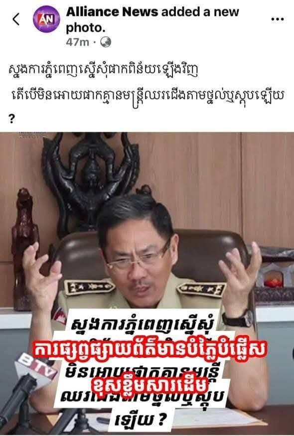 ក្រុមការងារព័ត៌មាន និងប្រតិកម្មរហ័សនៃស្នងការដ្ឋាននគរបាលរាជធានីភ្នំពេញ បំភ្លឺពាក់ព័ន្ធករណីផេកហ្វេសប៊ុកឈ្មោះ អវតា ស និងផេកហ្វេសប៊ុកឈ្មោះ Alliance News ដែលបង្ហោះខ្លឹមសារថា “ស្នងការភ្នំពេញស្នើសុំផាកពិន័យឡើងវិញ តើបើមិនអោយផាកគ្មានមន្ត្រីឈរជើងតាមថ្នល់ឬស្តុបឡើយ ?”