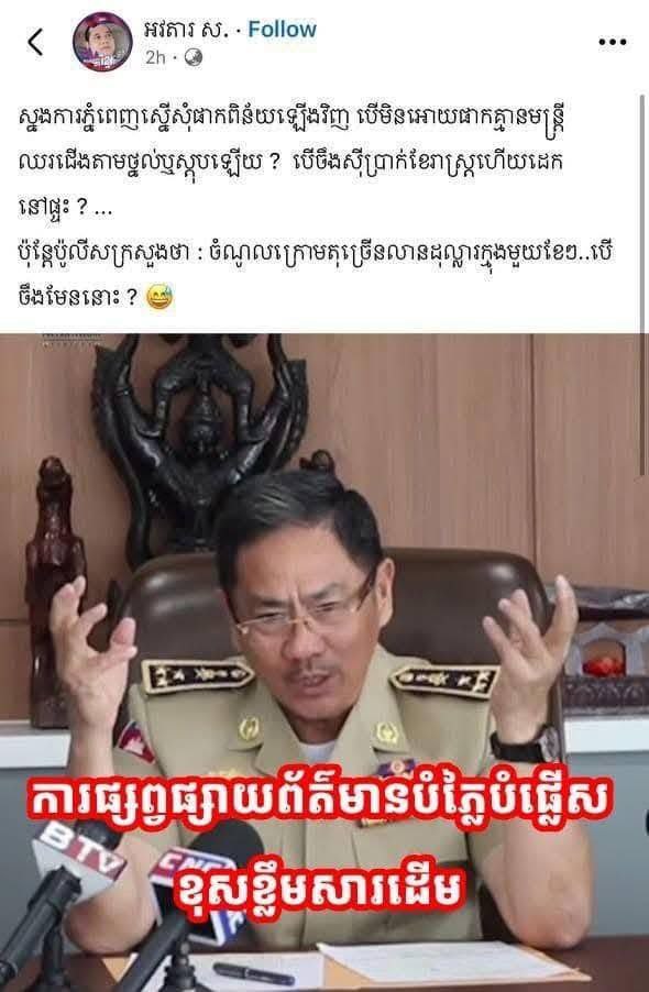 ស្នើសុំឲ្យម្ចាស់ផេកខាងលើត្រូវកែសម្រួលខ្លឹមសារឡើងវិញហើយត្រូវពិនិត្យនិងស្តាប់ខ្លឹមសារដើមរបស់ឯកឧត្តមស្នងការឲ្យបានច្បាស់លាស់ត្រឹមត្រូវ មុននឹងយកទៅបង្ហោះផ្សព្វផ្សាយកុំឲ្យមហាជនមានការយល់ច្រឡំ៕