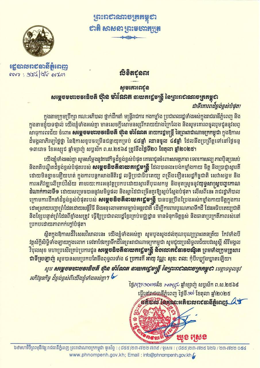 (ភ្នំពេញ)៖ ក្នុងឱកាសដ៏មង្គលសួស្តី នៃថ្ងៃខួបកំណើត សម្តេចមហាបវរធិបតី ហ៊ុន ម៉ាណែត នាយករដ្ឋមន្រ្តីនៃព្រះរាជាណាចក្រកម្ពុជា គម្រប់ ៤៨ឆ្នាំ ឈានចូល ៤៩ឆ្នាំ នាថ្ងៃទី២០ ខែតុលា ឆ្នាំ២០២៥, ឯកឧត្តម ឃួង ស្រេង អភិបាលរាជធានីភ្នំពេញ និងលោកជំទាវ ព្រមទាំងមន្រ្តីក្រោមឱវាទទាំងអស់ សូមផ្ញើសារលិខិតគោរពជូនពរ សម្តេចមហាបវរធិបតី ទទួលបានសុខភាពល្អបរិបូរណ៍ បញ្ញាញាណភ្លឺថ្លា អាយុយឺនយូរ ដើម្បីបន្តបេសកកម្មដ៏ឧត្តុង្គឧត្តម ដើម្បីដឹកនាំកម្ពុជាឱ្យរីកចម្រើនរុងរឿងតទៅ។