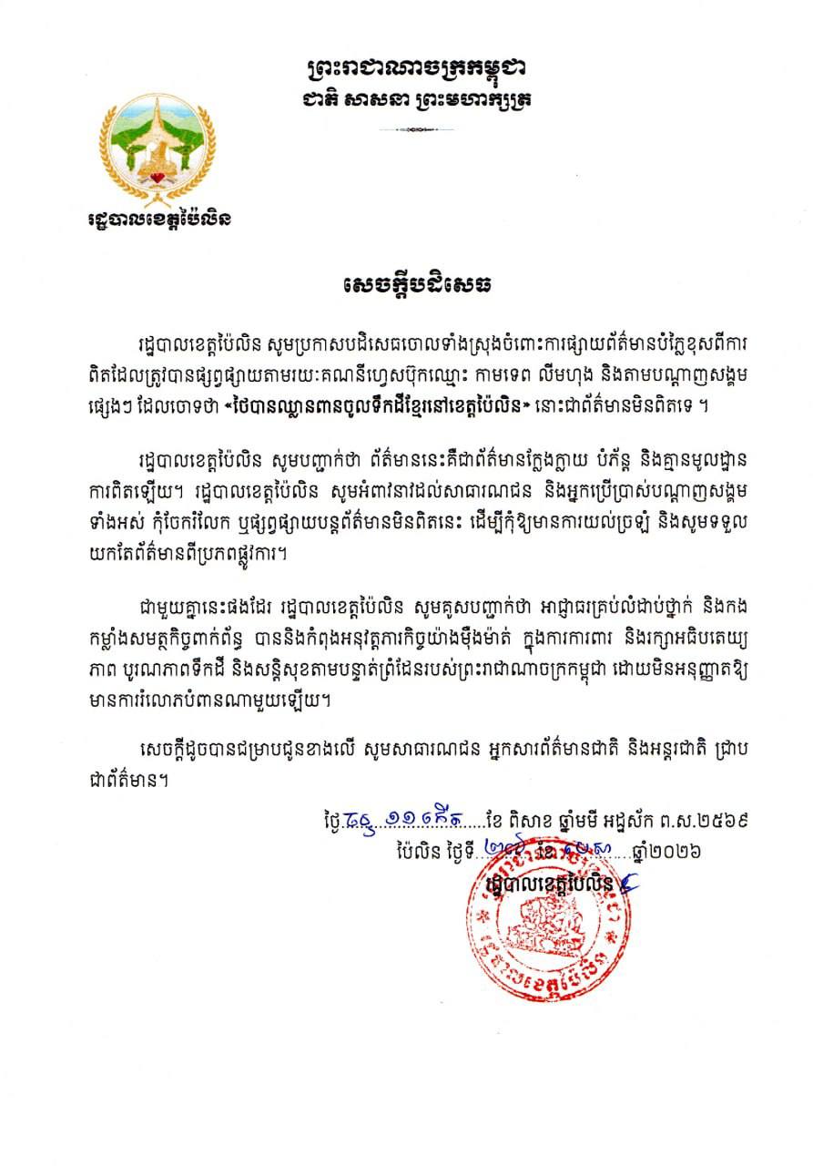 សេចក្តីប្រកាសព័ត៌មាននៅថ្ងៃទី២៦ ខែមេសា ឆ្នាំ២០២៦ រដ្ឋបាលខេត្តប៉ៃលិន បានបញ្ជាក់ថា «ព័ត៌មាននេះគឺជាព័ត៌មានក្លែងក្លាយ បំភ័ន្ត និងគ្មានមូលដ្ឋាន ការពិតឡើយ។ រដ្ឋបាលខេត្តប៉ៃលិន សូមអំពាវនាវដល់សាធារណជន និងអ្នកប្រើប្រាស់បណ្តាញសង្គម ទាំងអស់ កុំចែករំលែក ឬផ្សព្វផ្សាយបន្តព័ត៌មានមិនពិតនេះ ដើម្បីកុំឱ្យមានការយល់ច្រឡំ និងសូមទទួល យកតែព័ត៌មានពីប្រភពផ្លូវការ»។