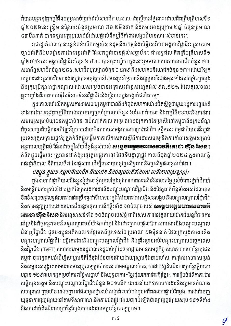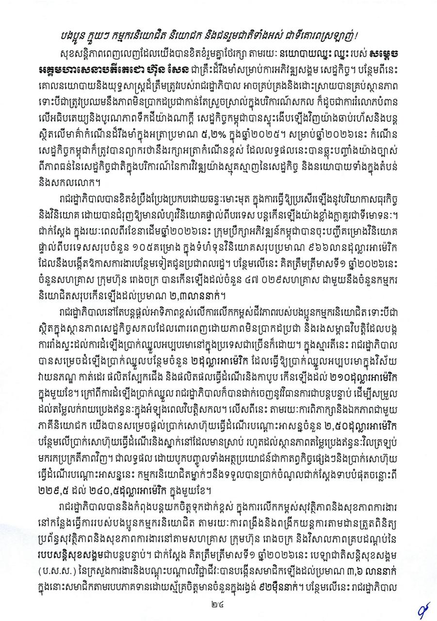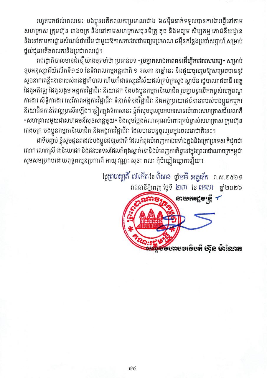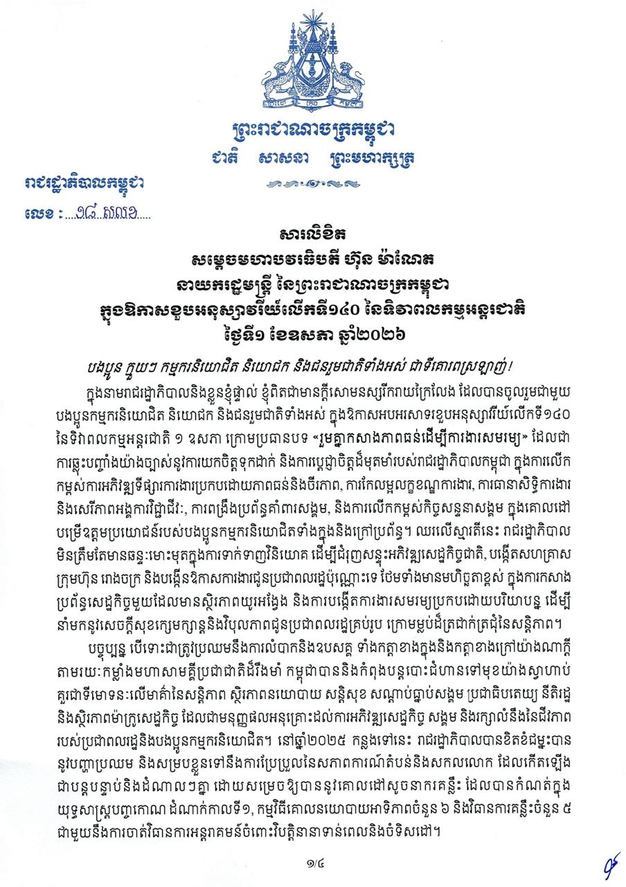 ការលើកឡើងនេះ បានធ្វើក្នុងឱកាសដែលសម្ដេចបានចេញសារលិខិត នៅថ្ងៃទី២៧ ខែមេសា ឆ្នាំ២០២៦ ក្នុងឱកាសខួបអនុស្សាវរីយ៍លើកទី១៤០ នៃទិវាពលកម្មអន្តរជាតិ ថ្ងៃទី១ ខែឧសភា ឆ្នាំ២០២៦ ក្រោមប្រធានបទ «រួមគ្នាកសាងភាពធន់ ដើម្បីការងារសមរម្យ»។