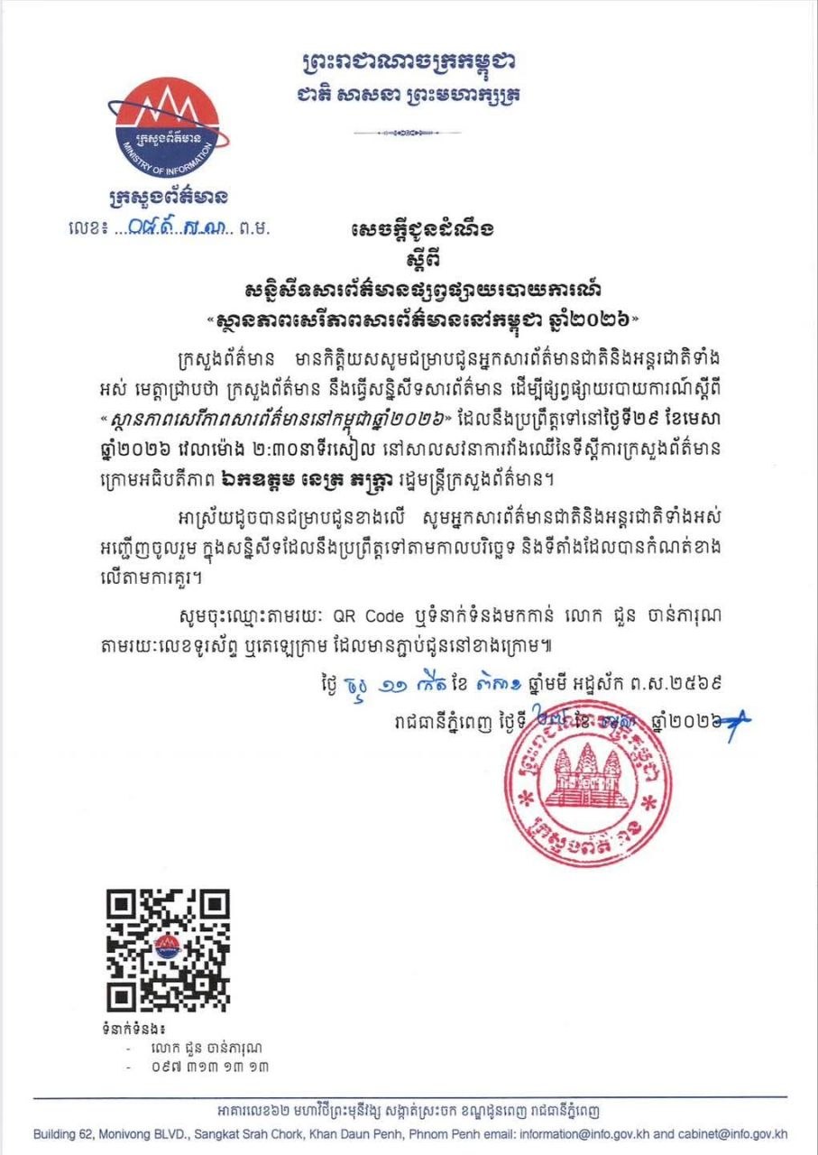 ភ្នំពេញ៖ តាមការគ្រោងទុក ក្រសួងព័ត៌មាន នឹងធ្វើសន្និសីទសារព័ត៌មាន ដើម្បីផ្សព្វផ្សាយរបាយការណ៍ស្តីពី «ស្ថានភាពសេរីភាពសារព័ត៌មាននៅកម្ពុជាឆ្នាំ២០២៦» ដែលនឹងប្រព្រឹត្តទៅនៅថ្ងៃទី២៩ ខែមេសា ឆ្នាំ២០២៦ វេលាម៉ោង ២:៣០នាទីរសៀល នៅសាលសវនាការវាំងឈើនៃទីស្តីការក្រសួងព័ត៌មាន ក្រោមអធិបតីភាពលោក នេត្រ ភក្ត្រា រដ្ឋមន្ត្រីក្រសួងព័ត៌មាន។
