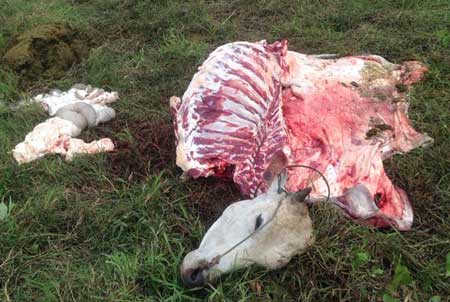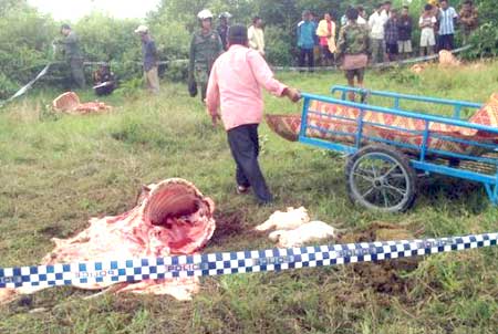បាត់ដំបង ៖ បុរសម្នាក់ពេលក្រោកពីដេកព្រឹកថ្ងៃទី១៣ ខែធ្នូ ឆ្នាំ២០១៤ បាត់គោញី៣ក្បាល រួចមានការភ្ញាក់ផ្អើល សមត្ថកិច្ច និងអ្នកជិតខាងជួយរក ឃើញគ្រោងឆ្អឹងគោ១ក្បាលនៅចំណុចវាលស្រែ ចំងាយពីផ្ទះជនរងគ្រោះ ប្រហែល ១ គីឡូម៉ែត្រក្នុងភូមិ ឃុំព្រៃស្វាយ ស្រុកមោងឬស្សី រីឯគោ ២ ក្បាលទៀត បាត់ស្រមោលឈឹង ។