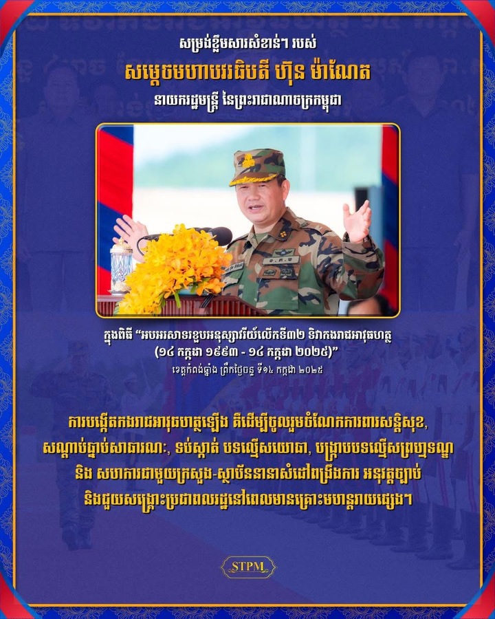 សម្តេចមហាបវរធិបតី ហ៊ុន ម៉ាណែត នាយករដ្ឋមន្ត្រីនៃព្រះរាជាណាចក្រកម្ពុជា បានថ្លែងក្នុងពិធីសម្ពោធដាក់ឱ្យប្រើប្រាស់ជាផ្លូវការនូវសមិទ្ធផលមជ្ឈមណ្ឌលហ្វឹកហ្វឺន កងរាជអាវុធហត្ថភ្នំជុំសែន រីករាយ និងអបអរសាទរខួបលើកទី៣២ ទិវាកងរាជអាវុធហត្ថ ១៤ កក្កដា ១៩៩៣ – ១៤ កក្កដា ២០២៥ នៅខេត្តកំពង់ឆ្នាំង នាព្រឹកថ្ងៃចន្ទ ទី១៤ ខែកក្កដា ឆ្នាំ២០២៥ ថា៖ ការបង្កើត កងរាជអាវុធហត្ថឡើង គឺដើម្បីចូលរួមចំណែកការពារសន្តិសុខ, សណ្តាប់ធ្នាប់សាធារណៈ, ទប់ស្កាត់ បទល្មើសយោធា, បង្ក្រាបបទល្មើសព្រហ្មទណ្ឌ និងសហការជាមួយក្រសួង-ស្ថាប័ននានា សំដៅពង្រឹងការអនុវត្តច្បាប់ និងជួយសង្គ្រោះប្រជាពលរដ្ឋនៅពេលមានគ្រោះមហន្តរាយផ្សេងៗ។ បើសិនជាគ្មានការពុះពារ គ្មានការខិតខំប្រឹងប្រែង គ្មានចក្ខុវិស័យវែងឆ្ងាយនោះទេ ទីនេះមិនអាចប្រែក្លាយពីកន្លែងទីវាល ទៅជាកន្លែងដែលមានលទ្ធភាពទទួលការហ្វឹកហ្វឺននោះទេ។