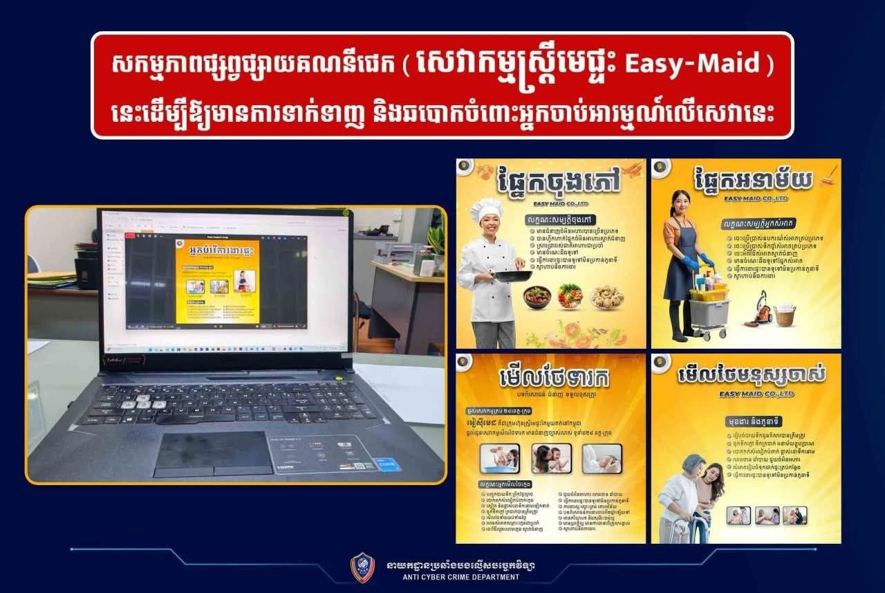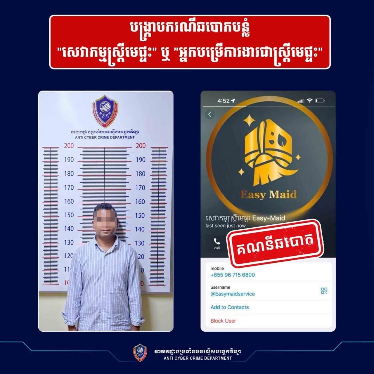 រាជធានីភ្នំពេញ ៖ យោងតាមបទបញ្ជារបស់ ឯកឧត្ដម នាយឧត្ដមសេនីយ៍ ស ថេត អគ្គស្នងការនគរបាលជាតិ និងតាមការចង្អុលណែនាំពី ឯកឧត្ដម ឧត្ដមសេនីយ៍ឯក អគ្គស្នងការរងនគរបាលជាតិ នៅថ្ងៃទី២១ ខែកក្កដា ឆ្នាំ២០២៥ នាយកដ្ឋានប្រឆាំងបទល្មើសបច្ចេកវិទ្យា សហការជាមួយ ស្នងការដ្ឋាននគរបាលខេត្តសៀមរាប បានធ្វើការឃាត់ខ្លួនជនសង្ស័យ០១រូប ឈ្មោះ ឃ.ឡ អាយុ៣៨ឆ្នាំ ដែលជាម្ចាស់ផេកហ្វេសប៊ុក និង តេឡេក្រាម ឈ្មោះ «សេវាកម្មស្រ្តីមេផ្ទះ Easy-Maid»។ យោងតាមការទទួលពាក្យបណ្តឹងរបស់ជនរងគ្រោះ នាយកដ្ឋានបានទទួលពាក្យបណ្តឹងលើករណីនេះជាង៣០បណ្តឹង ដែលមានទំហំទឹកប្រាក់ប្រមាណជាង២ម៉ឺនដុល្លារ ប៉ុន្តែតាមរយៈការស្រាវជ្រាវ ជំនាញកំណត់បានថា ជនសង្ស័យរូបនេះបានធ្វើការឆបោកជនរងគ្រោះជាងរយនាក់ និងទំហំទឹកប្រាក់ប្រមាណជាង ១០ម៉ឺនដុល្លារតាំងពីឆ្នាំ២០២២មកម្លេះ។