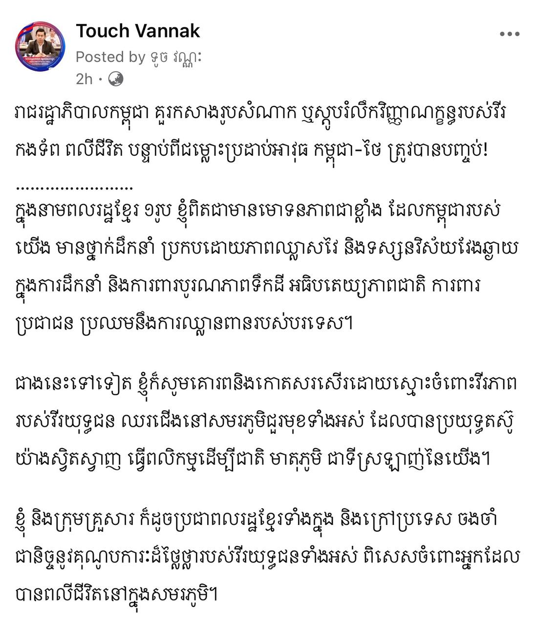 ភ្នំពេញ ៖ នាល្ងាចថ្ងៃទី១ ខែសីហា ឆ្នាំ២០២៥ លោកបណ្ឌិត ទូច វណ្ណៈ (Touch Vannak) បានបង្ហោះសារតាមរយៈផេកផ្លូវការរបស់ខ្លួន ដោយដាក់ចំណងជើងថា “រាជរដ្ឋាភិបាលកម្ពុជា គួរកសាងរូបសំណាក ឬស្តូបរំលឹកវិញ្ញាណក្ខន្ធរបស់វីរកងទ័ព ពលីជីវិត បន្ទាប់ពីជម្លោះប្រដាប់អាវុធ កម្ពុជា-ថៃ ត្រូវបានបញ្ចប់”។