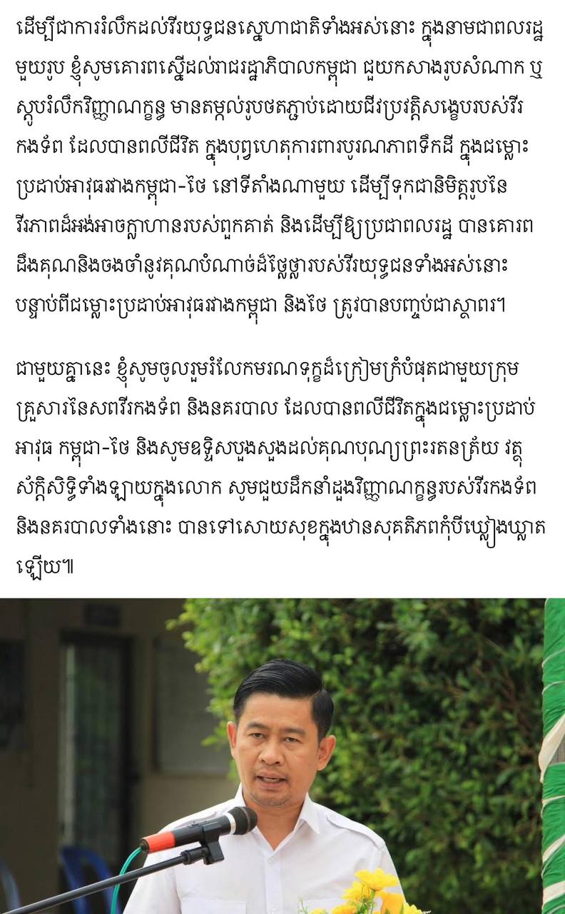 ជាមួយគ្នានេះ ខ្ញុំសូមចូលរួមរំលែកមរណទុក្ខដ៏ក្រៀមក្រំបំផុតជាមួយក្រុមគ្រួសារនៃសពវីរកងទ័ព និងនគរបាល ដែលបានពលីជីវិតក្នុងជម្លោះប្រដាប់អាវុធ កម្ពុជា-ថៃ និងសូមឧទ្ទិសបួងសួងដល់គុណបុណ្យព្រះរតនត្រ័យ វត្ថុស័ក្តិសិទ្ធិទាំងឡាយក្នុងលោក សូមជួយដឹកនាំដួងវិញ្ញាណក្ខន្ធរបស់វីរកងទ័ព និងនគរបាលទាំងនោះ បានទៅសោយសុខក្នុងឋានសុគតិភពកុំបីឃ្លៀងឃ្លាតឡើយ៕
