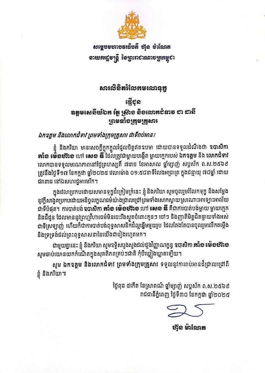 (ភ្នំពេញ)៖ សម្តេចមហាបវរធិបតី ហ៊ុន ម៉ាណែត នាយករដ្ឋមន្រ្តីនៃកម្ពុជា សូមផ្ញើសារលិខិតរំលែកទុក្ខជូន ឧត្តមសេនីយ៍ឯក រ័ត្ន ស្រ៊ាង មេបញ្ជាការរង កងរាជអាវុធហត្ថលើផ្ទៃប្រទេស មេបញ្ជាការ កងរាជអាវុធហត្ថរាជធានីភ្នំពេញ និងលោកជំទាវ ជា ដានី ព្រមទាំងក្រុមគ្រួសារ ចំពោះមរណភាពរបស់ឧបាសិកា កាំង ម៉េងហ៊ាង ហៅ សេង ឌី ដែលត្រូវជាម្តាយក្មេករបស់ ឯកឧត្តម នៅថ្ងៃព្រហស្បតិ៍ ទី១៧ ខែកក្កដា ឆ្នាំ២០២៥ ម៉ោង០១:៥៨នាទី រំលងអាធាត្រ (នៅសហរដ្ឋអាមេរិក) ក្នុងជន្មាយុ ៧៨ឆ្នាំ ដោយរោគាពាធ។