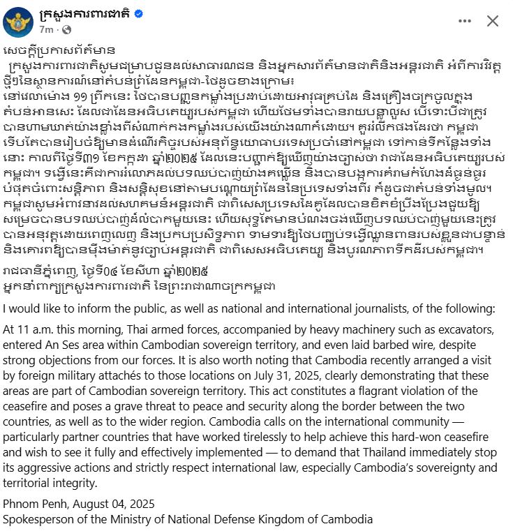 យោងតាមសេចក្តីថ្លែងការណ៍របស់អ្នកនាំពាក្យក្រសួងការពារជាតិនៃព្រះរាជាណាចក្រកម្ពុជានៅថ្ងៃទី៤ សីហា ឆ្នាំ២០២៥លើកឡើងថាចំពោះរំលោភបំពានយ៉ាងគឃ្លើនម្តងហើយម្តងទៀតរបស់ភាគីថៃលើបូរណភាពទឹកដីកម្ពុជា និងរំលោភបទឈប់បាញ់។