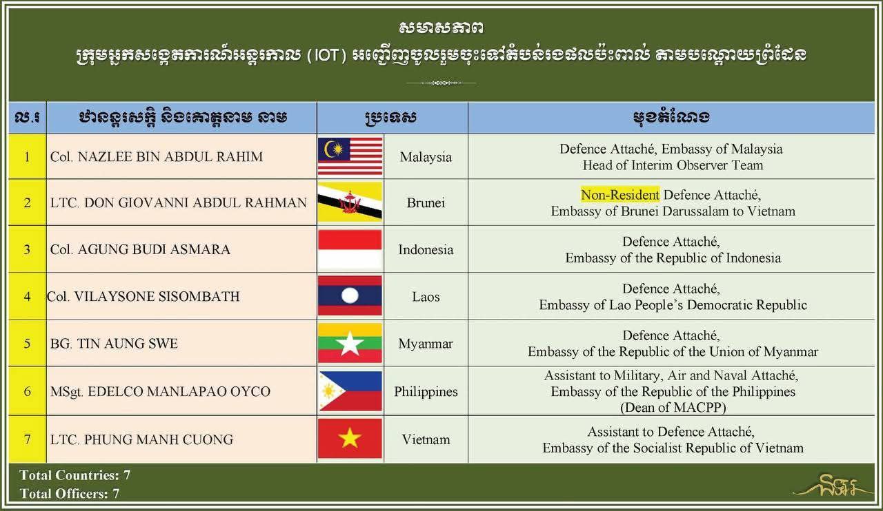 ក្រសួងការពារជាតិ នៃព្រះរាជាណាចក្រកម្ពុជា បានសម្របសម្រួលជូន ក្រុមអ្នកសង្កេតការណ៍អន្តរកាល (IOT) ដឹកនាំដោយ លោកវរសេនីយ៍ឯក NAZLEE BIN ABDUL RAHIM អនុព័ន្ធយោធាម៉ាឡេស៊ី ប្រចាំកម្ពុជា ដែលមានតំណាងមកពីប្រទេសចំនួន ៦ ចូលរួម (ប្រ៊ុយណេ ឥណ្ឌូនេស៊ី ឡាវ មីយ៉ាន់ម៉ា ហ្វីលីពីន និងវៀតណាម) ដែលមាននិវេសន្នដ្ឋានក្នុង និងក្រៅប្រទេសកម្ពុជា ដោយមានសមាជិកសរុបចំនួន ៧ប្រទេស បានចេញដំណើរទៅកាន់ទីតាំងជាក់ស្តែងផ្សេងៗ ដើម្បីសង្កេតមើលស្ថានភាពសន្តិសុខតាមព្រំដែន ដែលប៉ះពាល់ផ្ទាល់ក្នុងអំឡុងជម្លោះព្រំដែនកម្ពុជា-ថៃ ដូចខាងក្រោម៖