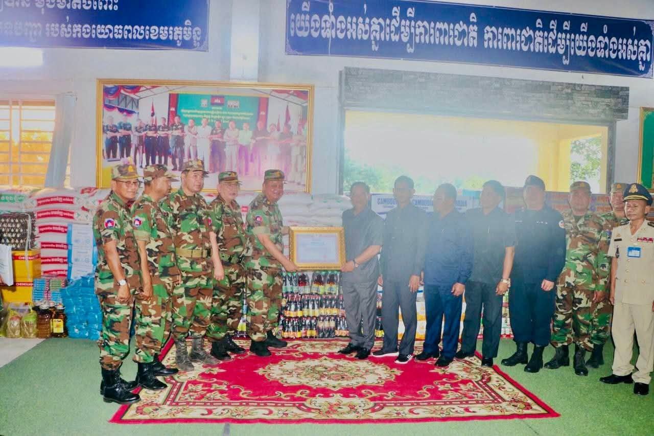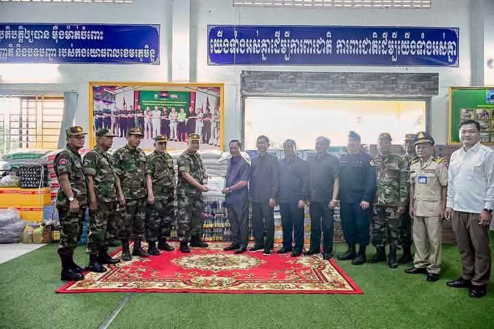 ឯកឧត្តម អភិបាលខេត្ត បញ្ជាក់ថាអំណោយបាននាំយកមកនេះ ជាទឹកចិត្តមហាសាមគ្គី របស់ សប្បុរសធម៌គ្រប់មជ្ឈដ្ឋានរបស់បងប្អូន ប្រជាពលរដ្ឋខេត្តតាកែវ ជូនដល់បងប្អូ នកងទ័ពនៅពេលនេះរួមមាន អង្ករ ៣០០០គីឡូ ទឹកសុទ្ធ១១០កេះ ភេសជ្ជៈ ១៥កេះ មី២០០កេះ ត្រីខ១០០យួ ទឹកត្រី៤០យួ ទឹកស៊ីអ៊ីវ៤០យួ អំបិល៦០គីឡូ ឆៃប៉ូវ១០០គីឡូ ម្សៅស៊ុប៦គីឡូ ប្រេងឆា១៥លីត្រ សៀង ២៥គីឡូ ពងទា១១៨០គ្រាប់ កាហ្វេតែ១២កញ្ចប់ អាវយឺត២៣០អាវ បារី៧សុង សាប៊ូ៥៥គីឡូ ចង្គ្រានហ្គាសតូច៩ ដែកកេះ៧ប្រអប់ ធូកមូស ១០០ដុំ កៅអៀកបិទទូទៅ ៤កេះ រួមនិងថវិកា ២០លានរៀល ។