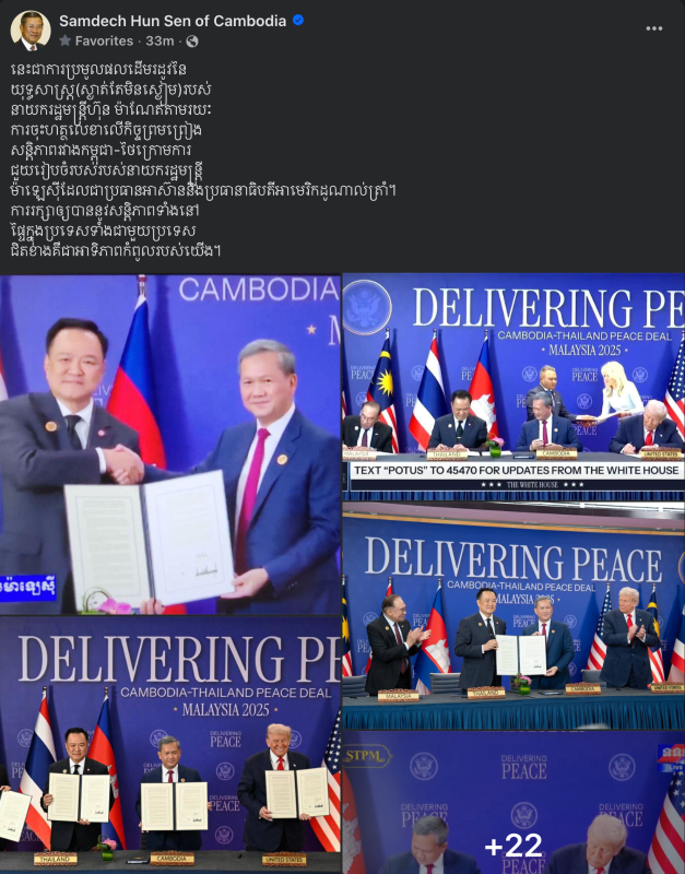 កិច្ចព្រមព្រៀងសន្តិភាពកម្ពុជា-ថៃ ត្រូវបានចុះហត្ថលេខានៅទីក្រុងកូឡាឡាំពួ នាព្រឹកថ្ងៃទី២៦ ខែតុលានេះដោយ សម្តេចមហាបវរធិបតី ហ៊ុន ម៉ាណែត នាយករដ្ឋមន្ត្រីកម្ពុជា និងលោក Anutin Charnvirakul នាយករដ្ឋមន្ត្រីថៃ ដោយមានការចូលរួមធ្វើជាសាក្សីពី លោកដូណាល់ ត្រាំ ប្រធានាធិបតីអាមេរិក និងនាយករដ្ឋមន្រ្តីម៉ាឡេស៊ី ជាសាក្សី។