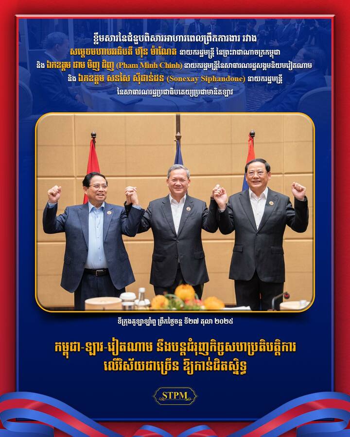 ថ្នាក់ដឹកនាំនៃប្រទេសទាំងបី បានចែករំលែកព័ត៌មានអំពីការវិវឌ្ឍ និងអាទិភាពពាក់ព័ន្ធនឹងកិច្ចសហប្រតិបត្តិការរវាងប្រទេសទាំងបី លើវិស័យជាច្រើន រួមមាន៖ សេដ្ឋកិច្ច, ពាណិជ្ជកម្ម, ទេសចរណ៍, សន្តិសុខ និងការពារជាតិ។ ថ្នាក់ដឹកនាំនៃប្រទេសទាំងបី បានឯកភាពបន្តពង្រឹងនិងពង្រីកបន្ថែមទៀតនូវកិច្ចសហប្រតិបត្តិការនៅក្នុងការតភ្ជាប់ ជាពិសេសការតភ្ជាប់ផ្លូវគមនាគមន៍ ការផ្គត់ផ្គង់អគ្គីសនី និងការទូទាត់តាមឌីជីថល។ ជាមួយនឹងប្រទេសឡាវ សម្ដេចបវរធិបតីបានជំរុញឱ្យអាជ្ញាធរពាក់ព័ន្ធនៃប្រទេសទាំងពីរ ពន្លឿនការជ្រើសរើសទីតាំងសាងសងស្ពានឆ្លងកាត់ទន្លេរពៅ-ទន្លេសេឡាំផាវ។