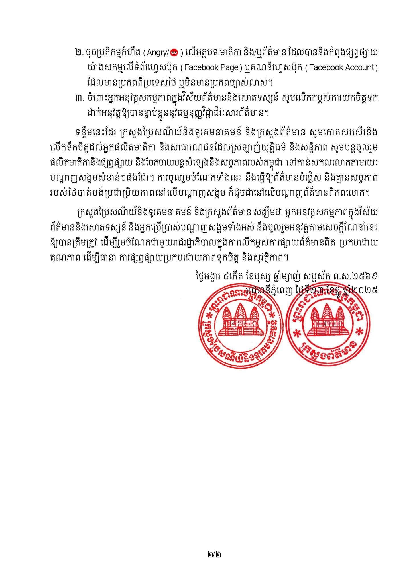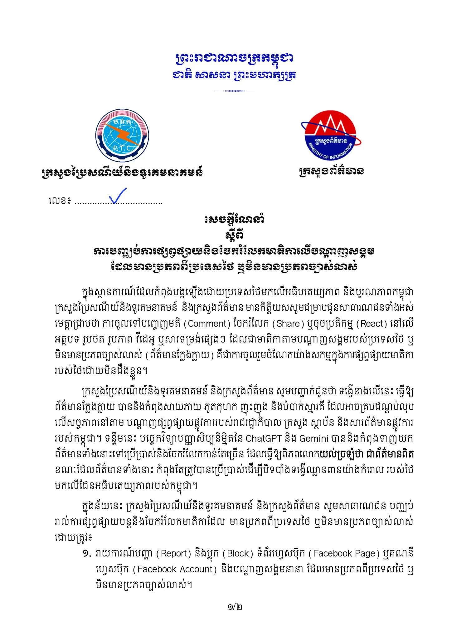 សេចក្តីណែនាំ ស្តីពីការបញ្ឈប់ការផ្សព្វផ្សាយនិងចែករំលែកមាតិកា លើបណ្តាញសង្គមដែលមានប្រភពពីប្រទេសថៃ ឬមិនមានប្រភពច្បាស់លាស់