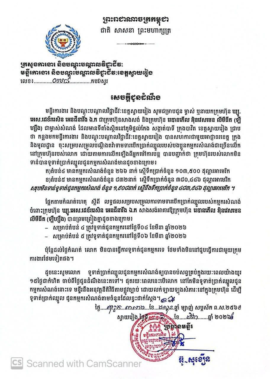 បន្ទាប់ពីភាគីក្រុមហ៊ុនបានខកខានមិនគោរពតាមកិច្ចសន្យាបើកប្រាក់ឈ្នួលជាលើកទី២។ ភ្លាមៗនោះ ក្រោមការបញ្ជាផ្ទាល់ពី ឯកឧត្តម ប៉េង ពោធិ៍សា អភិបាលខេត្តស្វាយរៀង ក្រុមការងារចម្រុះខេត្តដឹកនាំដោយលោកម៉ែន អេង អភិបាលរង តំណាងឯកឧត្ដមអភិបាលខេត្ត លោក អ៊ូ សុខឿន ប្រធានមន្ទីរការងារ និងបណ្តុះបណ្តាលវិជ្ជាជីវៈខេត្ត លោកដាំ ឃុនពិសី ប្រធានស្តីទីមន្ទីរព័ត៌មានខេត្ត និងអាជ្ញាធរមូលដ្ឋានពាក់ព័ន្ធ បានចុះអន្តរាគមន៍ដោះស្រាយវិវាទការងាររវាងភាគីកម្មករ អ្នកម៉ៅការ និងភាគីម្ចាស់ការដ្ឋានអគារ របស់ក្រុមហ៊ុន ឃ្យូ.អេស ដេខ័ររេសិន អេនជឺនារីង ឯ.ក សាងសង់អគារក្រុមហ៊ុន រេឌាន ភើល អិនវេសមេន លីមីធីត (ឡឹហ្សឹង) ដើម្បីការពារសិទ្ធិ និងផលប្រយោជន៍បងប្អូនកម្មករ នាព្រឹកថ្ងៃទី៦ ខែមីនា ឆ្នាំ២០២៦ ស្ថិតនៅភូមថ្នល់កែង សង្កាត់បាទី ក្រុងបាវិត ខេត្តស្វាយរៀង ។
