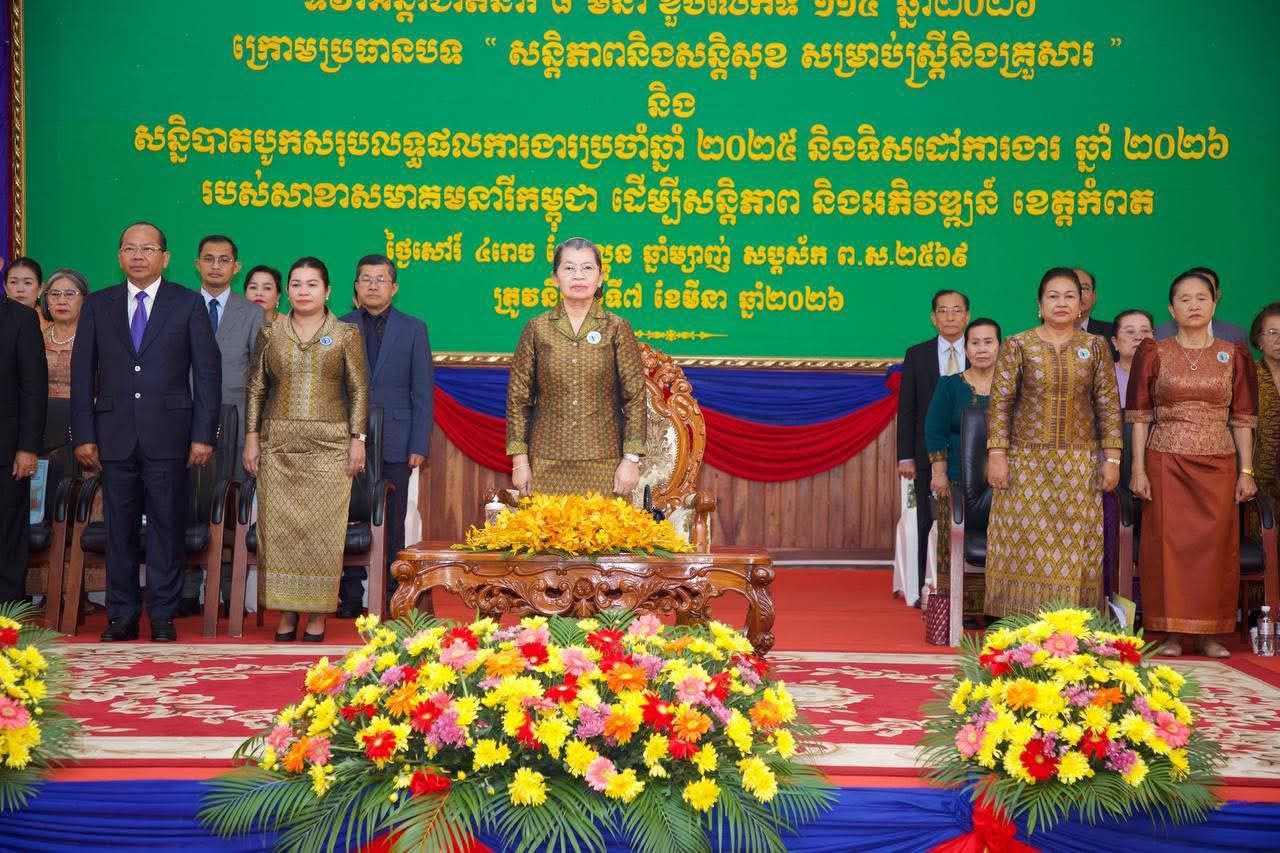 សម្តេចកិត្តិសង្គហបណ្ឌិត ម៉ែន សំអន ឧត្តមប្រឹក្សាផ្ទាល់ព្រះមហាក្សត្រ និងជាប្រធានសមាគមនារីកម្ពុជា ដើម្បីសន្តិភាព និងអភិវឌ្ឍន៍ បានអញ្ជើញជាអធិបតីក្នុងពិធីអបអរសាទរខួបលើកទី ១១៥ ទិវាអន្តរជាតិនារី ៨ មីនា ឆ្នាំ ២០២៦ ក្រោមប្រធានបទ “សន្តិភាព និងសន្តិសុខសម្រាប់ស្ត្រី និងគ្រួសារ” និងសន្និបាតបូកសរុបលទ្ធផលការងារប្រចាំឆ្នាំ ២០២៥ និងលើកទិសដៅបន្តឆ្នាំ ២០២៦ របស់សាខាសមាគមនារីកម្ពុជា ដើម្បីសន្តិភាព និងអភិវឌ្ឍន៍ខេត្តកំពត ដែលមានប្រសាសន៍ នាព្រឹកថ្ងៃសៅរ៍ ៤រោច ខែផល្គុន ឆ្នាំម្សាញ់ សប្តស័ក ព.ស.២៥៦៩ ត្រូវនឹងថ្ងៃទី៧ ខែមីនា ឆ្នាំ២០២៦។